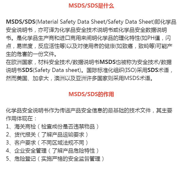 MSDS(Material Safety Data Sheet)即化学品安全说明书,亦可译为化学品安全技能说明书或化学品安全数据说明书。是化学品出产商和进口商用来说明化学品的理化特性(如PH值,闪点,易燃度,反响活性等)以及对运用者的健康(如致癌,致畸等)可能会发生的损害的一份文件。在欧洲国家,资料安全技能/数据说明书MSDS也被称为安全技能/数据说明书SDS(Safety Data sheet)。世界规范化安排(ISO)选用SDS术语,可是美国、加拿大,澳洲以及亚洲许多国家则选用MSDS术语。我国为同世界规范eqvISO110—14—1:1994(E)接轨也拟定了相关的规范GB/T16483-2008《化学品安全技能说明书内容和项目次序》,规则MSDS要有十六部分的内容。